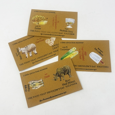 Postcards from each countries include their tradition,culture and fun messages. Elephant and Chinte are common animals in Myanmar as Chinte can be commonly found at the entrance of pagodas and elephants can be found at every pagodas in Myanmar and we,Myanmar people,believes that elephant is a lucky animal for us. Myanmar has certain rules about food combinations. Get it wrong and you may find yourself ill...or dead. Sure to put a smile on the face of your loved ones back home.